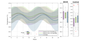 Les données recueillies sur l’évolution de la température interne pendant ces 32 heures ont ensuite été analysées et modélisées. Comme attendu, une baisse est par exemple observée au moment du coucher et la température remonte au moment du réveil. La modélisation permet de caractériser le rythme des participants en termes de phase et de les comparer.