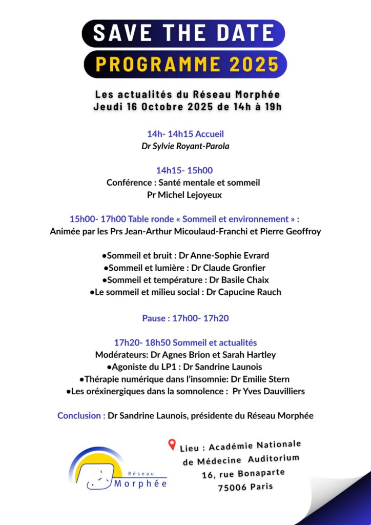 Le Réseau Morphée organise sa Journée d’actualités le jeudi 16 octobre 2025 à l’Académie nationale de médecine (Salle des Séances, 16 rue Bonaparte – 75006 Paris).
